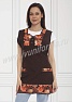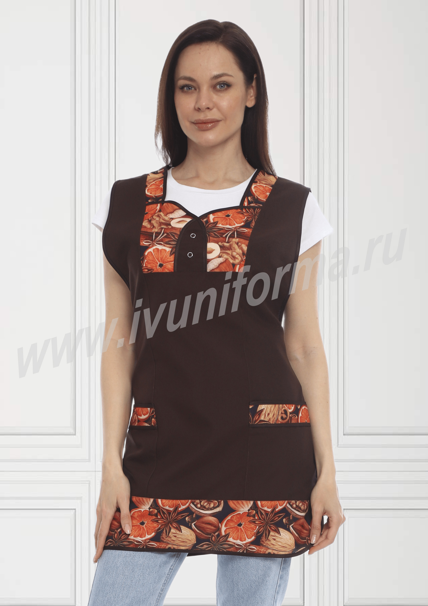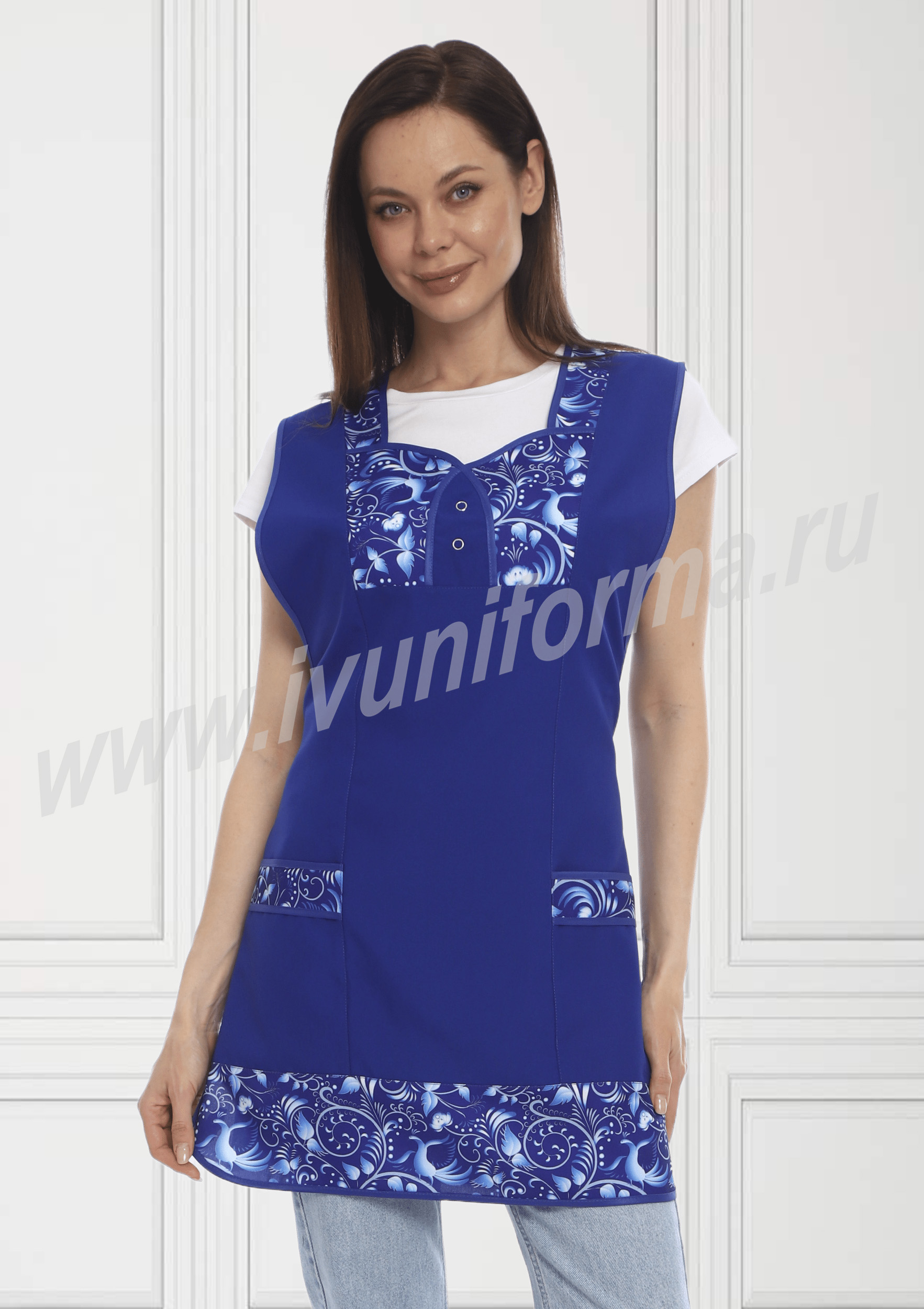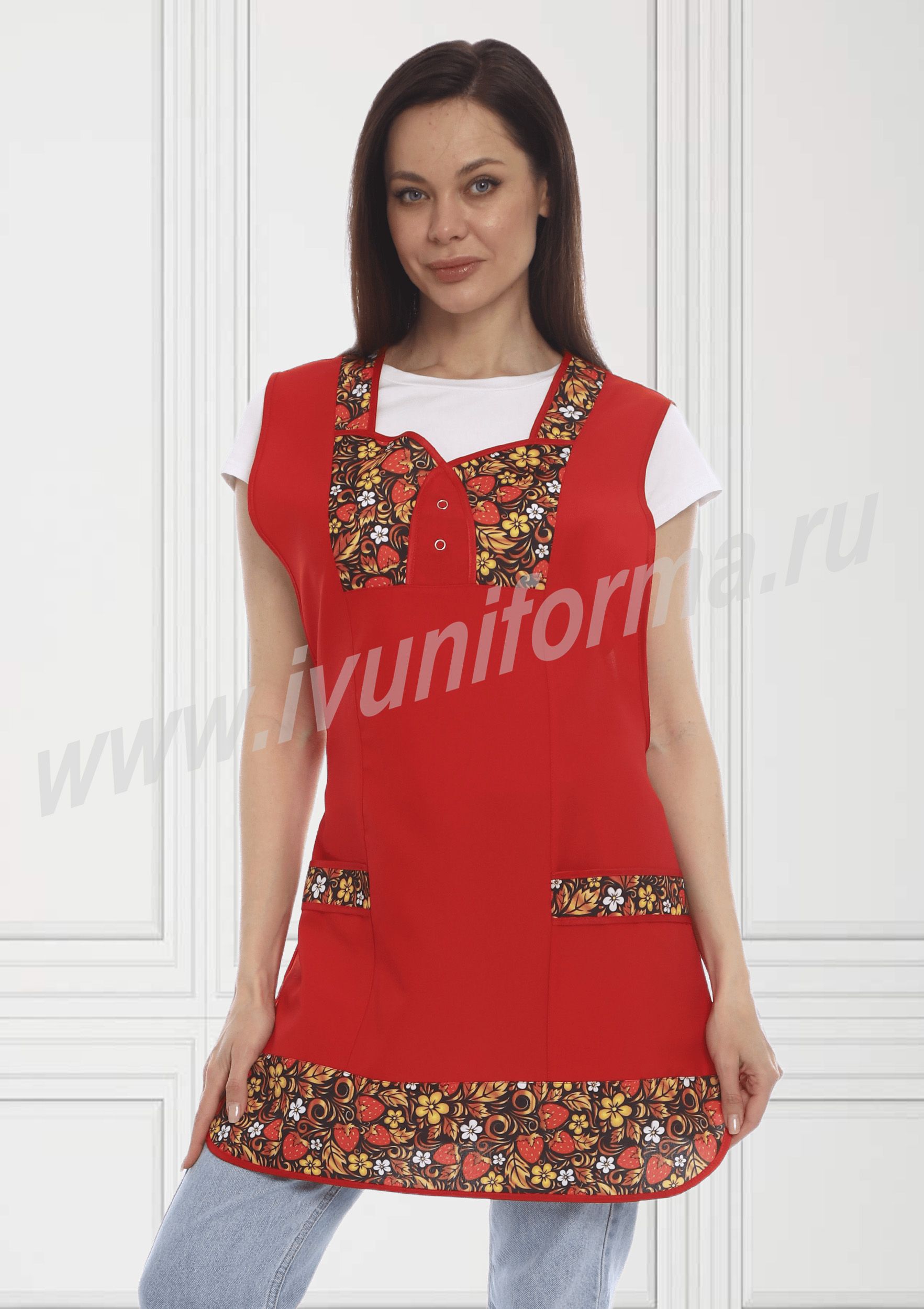 Фартук средней длины, перекидной, с фигурным вырезом горловины. Спинка прямая без отделки. Перед с отрезными бочками, центральная часть декорирована фигурными кокетками с имитацией застежки на кнопки, в нижней части фартука расположены вместительные карманы с отделкой. Ширина фартука по линии талии регулируется завязками – полупоясами. Яркий принт с традиционными мотивами создает оригинальный дизайн изделия, наполняет образ красотой и теплотой. Все срезы фартука обработаны кантом из прочной нейлоновой ткани. Фартук прост в уходе, не мнется, не линяет, удобный и практичный. Стильный фартук станет прекрасным выбором для участия в ярмарках, фестивалях и народных гуляниях.